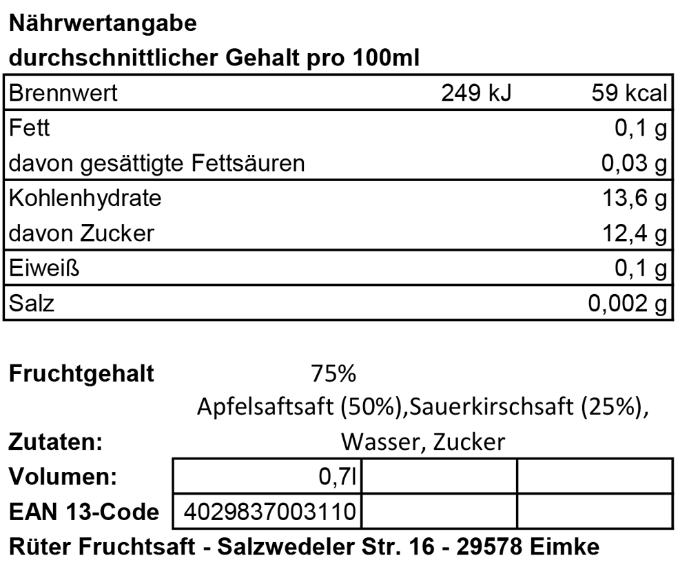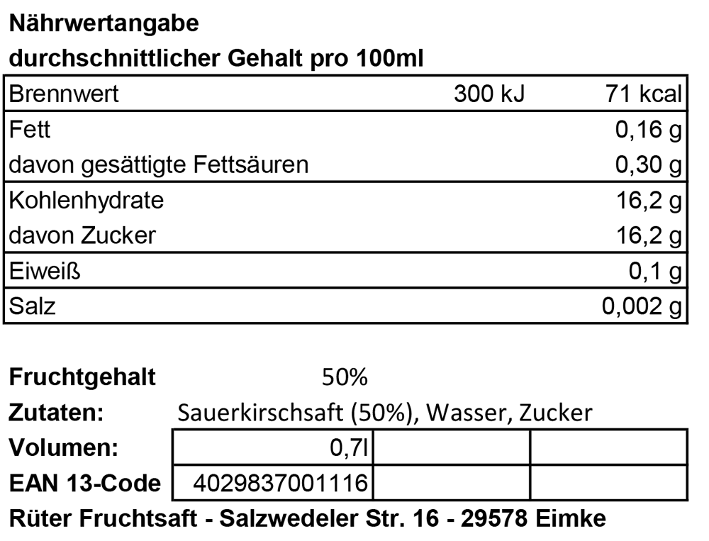 Unser Sauerkirsch Nektar wird aus Direktsaft hergestellt. Um die Fruchtsäure der Sauerkirschen zu reduzieren, wird der Kirsch-“Muttersaft” auf Trinkstärke herabgesetzt (Fruchtgehalt 50%) Für ein ausgewogenes Geschmackserlebnis süßen wir den Sauerkirsch Nektar mit Rübenzucker aus heimischer Produktion. Als Ergebnis erhalten Sie einen hochwertigen Frucht-Nektar, der ohne färbende Hilfsstoffe, ohne Aroma und ohne Konservierungsstoffe intensiv nach Kirschen schmeckt. Der ausgelobte Fruchtanteil stammt ausschließlich aus wertvollen Sauerkirschen und nicht aus günstigeren “Basis-Säften”