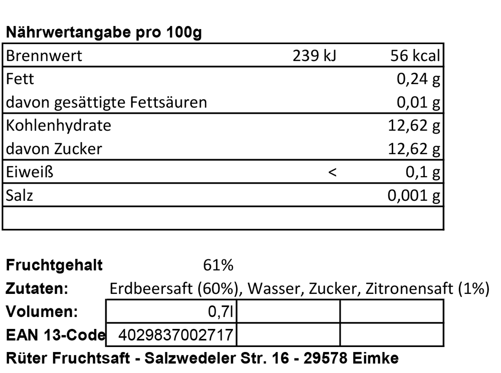 Erdbeer Nektar auch bei hochpreisigen Rohstoffen wie Erdbeeren bleiben wir dem Einsatz von echten Früchten treu. Rüter Erdbeernektar wird aus erntefrischen Erdbeeren gekeltert und zu Fruchtnektar verarbeitet. Abgerundet wird dieses Naturprodukt mit Zitronensaft und Zucker. Rüter Erdbeer-Nektar wird aus Direktsaft hergestellt. Um die Fruchtsäure und die Viskosität der Beeren zu reduzieren, wird der “Muttersaft” auf Trinkstärke herabgesetzt (Fruchtgehalt mind. 60 %) Für ein ausgewogenes Geschmackserlebnis süßen wir den Erdbeernektar mit Rübenzucker aus heimischer Produktion. Als Ergebnis erhalten Sie einen hochwertigen Fruchtnektar, der ohne färbende Hilfsstoffe, ohne Aroma und ohne Konservierungsstoffe intensiv nach Erdbeeren schmeckt. Der ausgelobte Fruchtanteil stammt ausschließlich aus Erdbeeren und Zitronen (ca. 2 % Fruchtanteil) und nicht aus günstigeren “Basis-Säften”.
