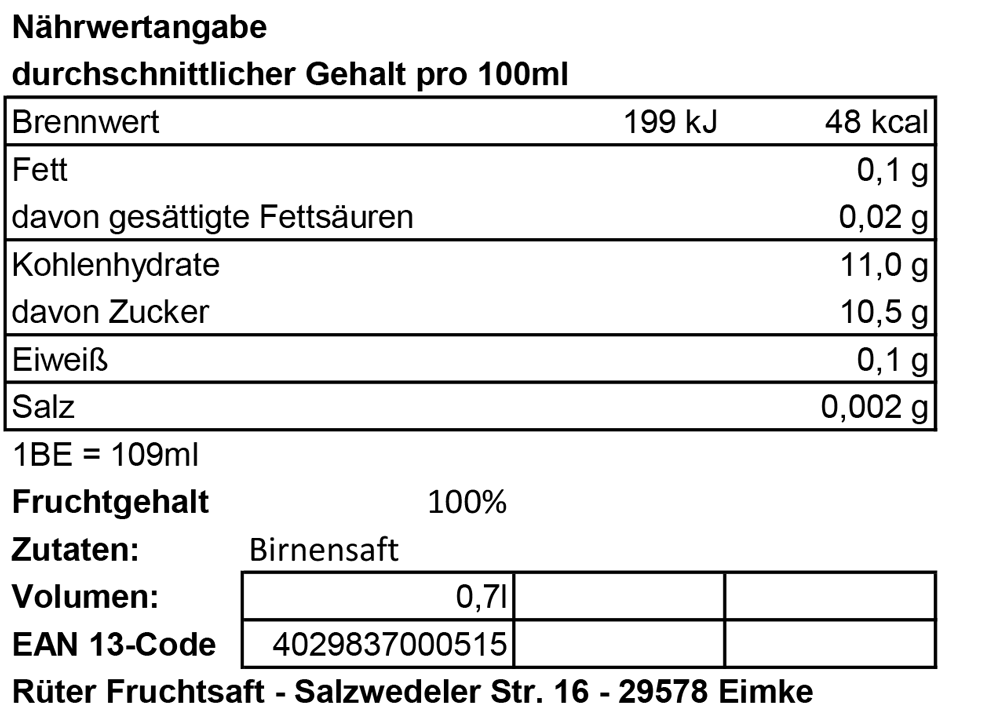 Birnensaft ist von Natur aus süß und säurearm. Eine “Korrekturzuckerung” ist gemäß Fruchtsaft-Verordnung nicht vorgesehen. Daher ist die Bezeichnung “ohne Zuckerzusatz gemäß Fruchtsaftverordnung” rein informativ. Leider darf dieses nicht einheitlich durch die Auslobung “ohne Zuckerzusatz” kenntlich gemacht werden. Kein einziger Fruchtsaft aus unserem Haus wird gezuckert.