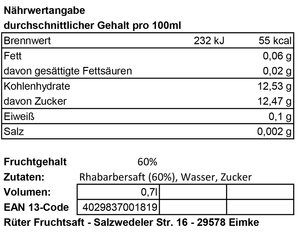 Rhabarber ist einheimisches Gemüse. Der Süßmost – wie die klassische Bezeichnung lautet – wird heute auch als Nektar bezeichnet. Durch die stark gestiegene Nachfrage an unserem Rhabarber Süßmost können wir diesen Nektar nur für einen kurzen Zeitraum (während und nach der Erntezeit) anbieten. Der frische Rhabarber wird zur Erntezeit (in Niedersachsen) von uns gekeltert. Aus dem Direktsaft produzieren wir den trinkfertigen Süßmost mit einem Gemüsesaftanteil von mind. 60 % Unser Genusstipp für warme Tage: Frisch zubereitete Rhabarber Schorle und für festliche Anlässe. Die Schorle besteht aus Rhabarber & Sekt abgerundet mit einer Erdbeere.